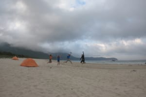Pe plajă ajungem odată cu un grup de chinezi, veniți cu yachtul. Până punem corturile grupul pleacă, nu fără emoții, căci între timp, datorită fluxului ajung la yacht mult mai uzi decât se așteptau. O scenă din filmele de comedie – un grup de chinezi îmbrăcați, cu căței în brațe, încercând să nu se ude prin apa până aproape de brâu și cu valuri. Amuzant. Rămânem singuri cuci, plaja este numai a noastră, (încă) curată, foarte înnorată dar foarte caldă. Băgăm plimbări în lung și-n lat și culegem diverse suveniruri: e plin de oase de sepie, fel și fel de pietricele interesante, un ou de rață ambalat în vid (?), și la fiecare val câte un plastic nou adus de mare. Ciudat de curat pentru cantitatea de plastic pe care o aduce marea….
